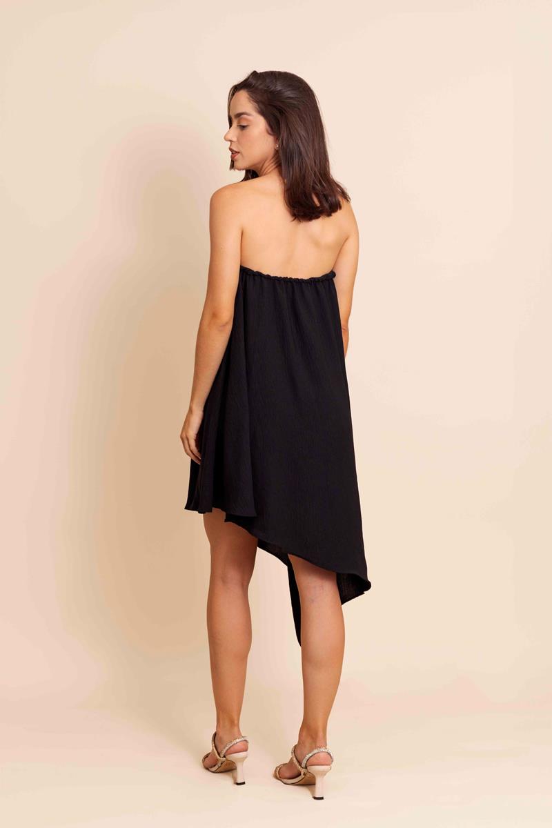 Vestido assimétrico com macaquinho por dentro, oferecendo estilo e conforto.
