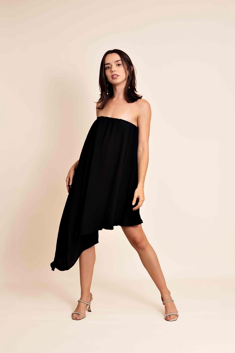 Vestido assimétrico com macaquinho por dentro, oferecendo estilo e conforto.